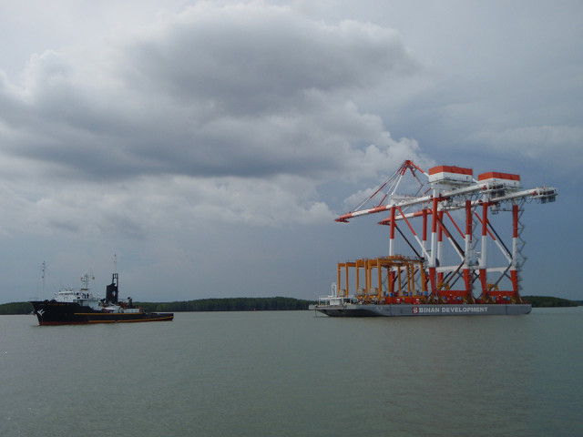 We transported 2 units of Container Crane & 3 units of Transfer Crane for Cai Mep Internatinal Container Terminal, Vietnam, by new barge "TENKOU" as maiden voyage and 1st Voyage of 3 voyages.