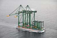 We transported 2 QC & 3 RTG for Indonesia as 1st voyage of 2 voyages by new barge TENMA, and the voyage is a maiden voyage for her.